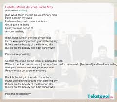 Bullets are the beauty Of the blistering sky Bullets are the beauty And I dont know why. Les balles sont la beauté de ce ciel de plomb. Bullets are the beauty of the blistering sky. Bullets are the beauty of the blistering sky. ------lyrics from Bullets by Archive-------. Bullets are the beauty of the blistering sky Bullets are the beauty And I dont know why Personal responsibility Personal responsibility Personal responsibility Personal responsibility Come find me let me be the lesser of a beautiful land Without the blood on his hands Come and make me a martyr come and break my feeling with your violence With a gun to my head. Bullets are the beauty Of the blistering sky Bullets are the beauty And I dont know why.